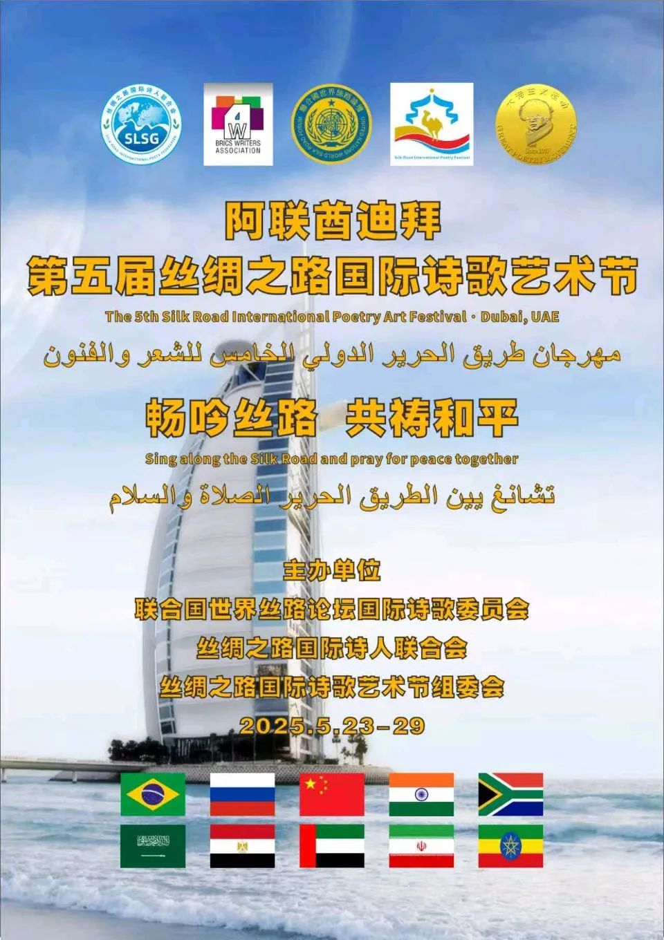 【UNWSF迪拜讯】2025年5月27日下午第五届丝绸之路国际诗歌艺术节在阿联酋迪拜国家图书馆盛大举行。来自中国、阿联酋、俄罗斯、阿拉伯国家及世界各地的诗人、艺术家、媒体和社会各界精英约500人出席诗歌艺术节颁奖盛典。阿联酋副总统兼总理、迪拜酋长 谢赫·穆罕默德·本·拉希德·阿勒马克图姆委派王子及二十余名王室成员和政府官员莅临会议。