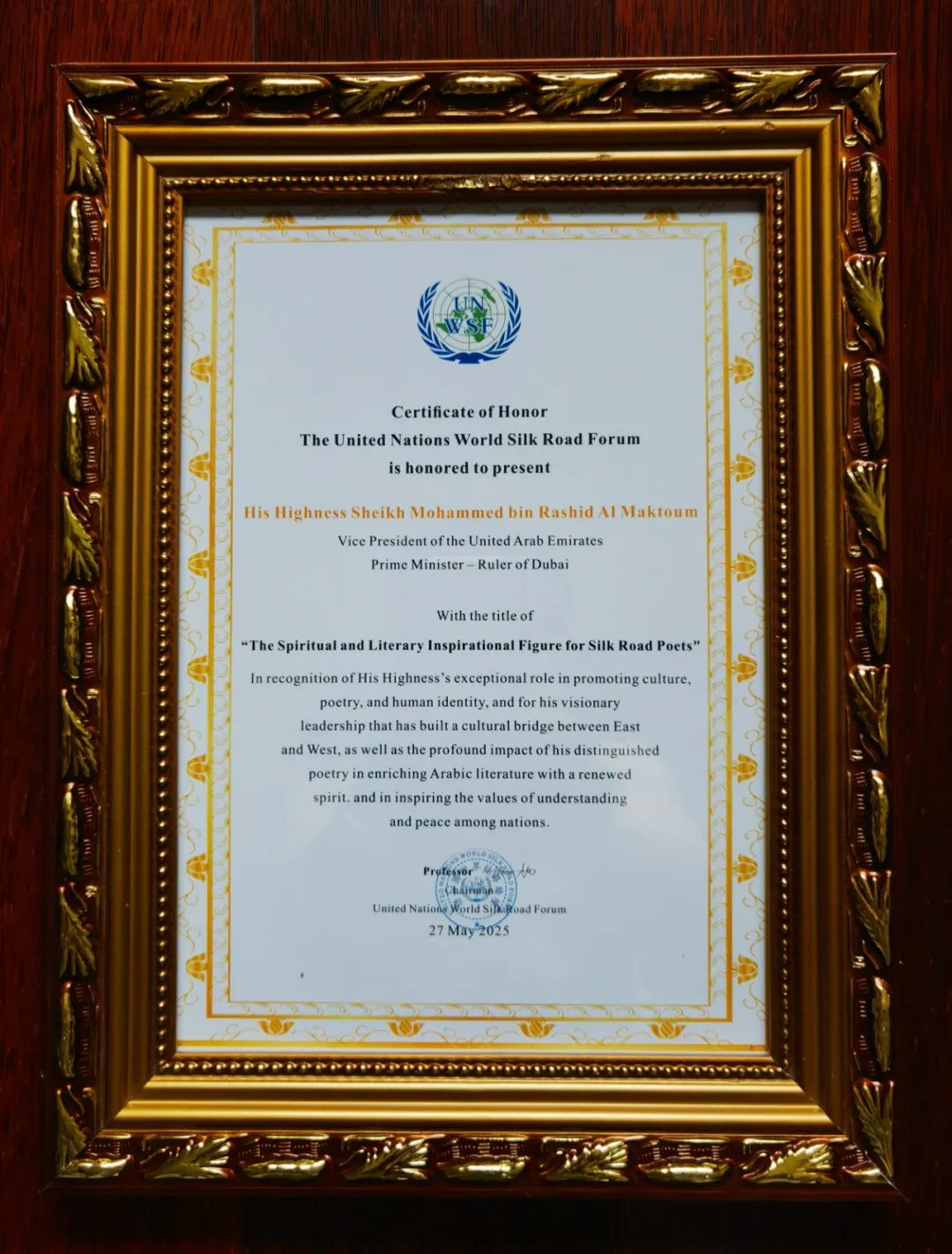 中国和阿联酋同属丝绸之路上两个伟大的国家,两干多年前中国的丝绸、茶叶、瓷器等经过丝绸之路到达中东地区,中国和阿拉伯人民早就结下了深厚的情谊。今天的迪拜在谢赫·穆罕默德·本·拉希德·阿勒马克图姆殿下的英明领导下,成为世界上最繁荣的现代化之城之一,丝路之城,诗意之城,殿下的诗歌阿拉伯世界广泛传诵,其中闪耀的博爱、智慧、哲思启迪鼓舞了无数的心灵。联合国世界丝路论坛决定把丝绸之路的文化与文学启蒙人物称号授予殿下,必将鼓励更多的人为弘扬伟大的世界丝路文化遗产,促进世界的和平和繁荣而努力!祝福伟大的迪拜在殿下的领导下更加欣欣向荣,富裕美丽。